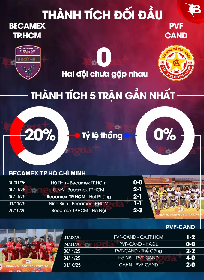 Sân nhà không phải là lợi thế tuyệt đối cho Becamex TP.HCM khi họ thường thi đấu tốt hơn trên sân đối phương. Tuy nhiên, kinh nghiệm V.League dày dặn có thể là yếu tố then chốt giúp họ kiểm soát thế trận. Trong khi đó, PVF-CAND với tâm thế không có gì để mất sẽ tìm mọi cách để giành ít nhất một điểm trên sân khách, khép lại lượt đi một cách an toàn.