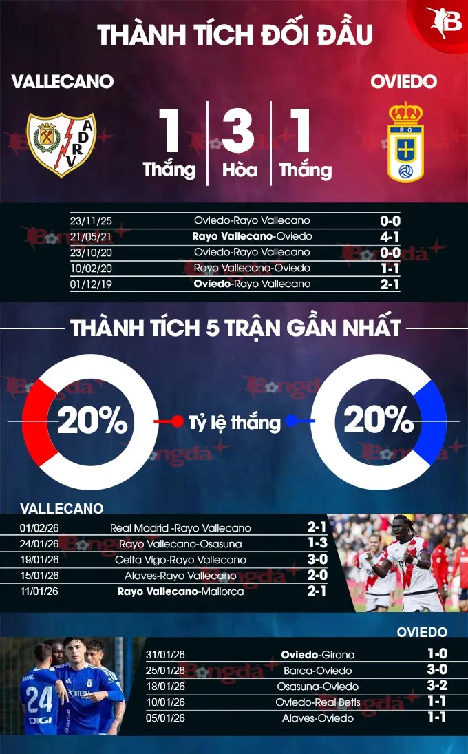 Trên lý thuyết, đây là cơ hội vàng để Vallecano vùng lên trước một đối thủ yếu. Nhưng lịch sử đối đầu lại nói lên điều ngược lại. Oviedo đã cầm hòa Vallecano trong 4/6 lần chạm trán gần nhất, biến họ thành một 'cơn ác mộng' bất ngờ. Trận đấu này khó lòng có một kết quả rõ ràng.