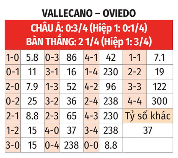- Bàn thắng sớm: Cả 4 lần gần nhất Vallecano đón tiếp Oviedo đều có bàn thắng trong hiệp 1. 4 trận sân nhà gần đây của họ cũng đều bị thủng lưới trước giờ nghỉ.